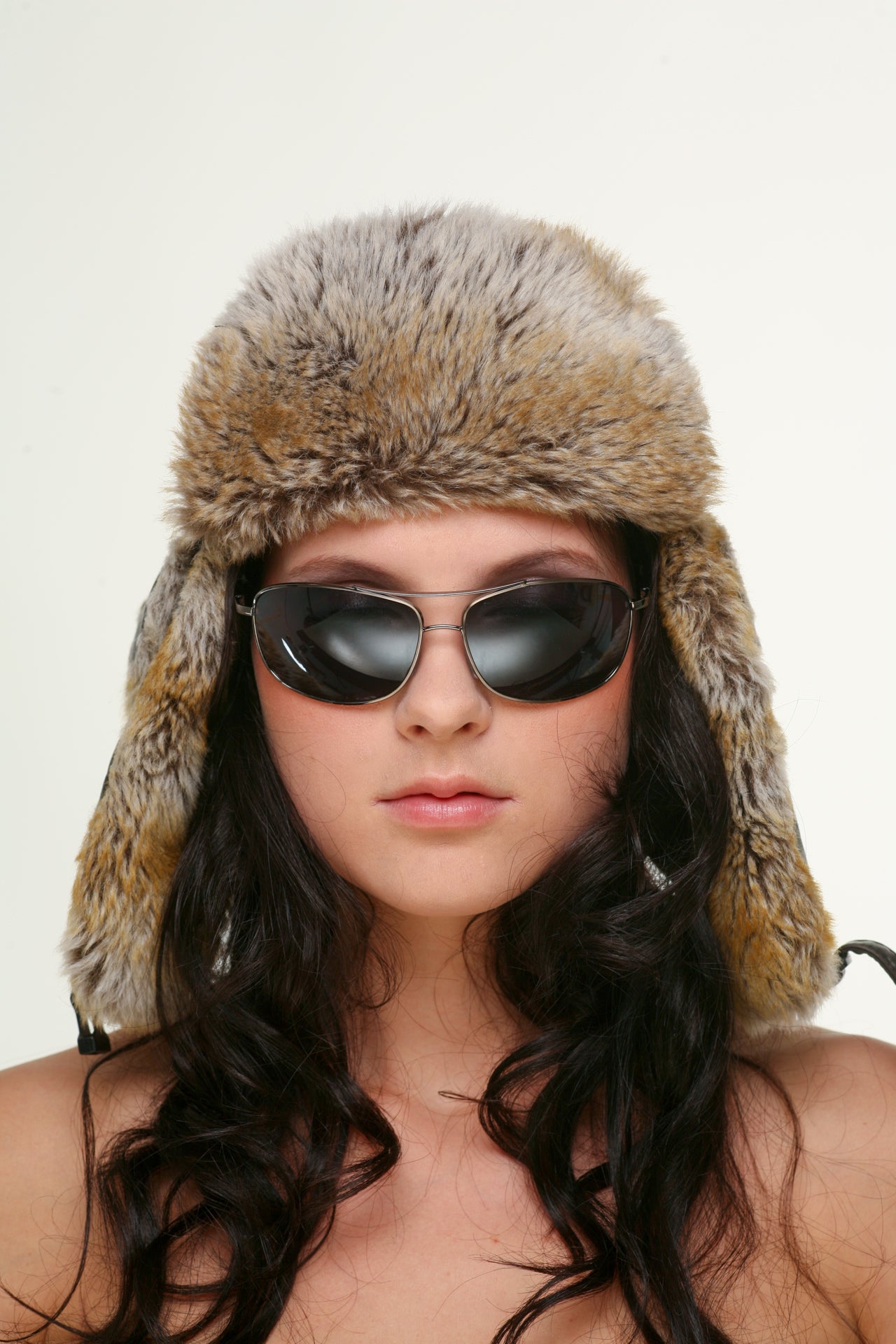 Trendy Mütze mit langen Ohrenklappen und Verschluß am Hals. Materialmix aus Leder, gesteppten Stoff und kuschelweichem Kunstfell. Mit Stoff gefüttert.