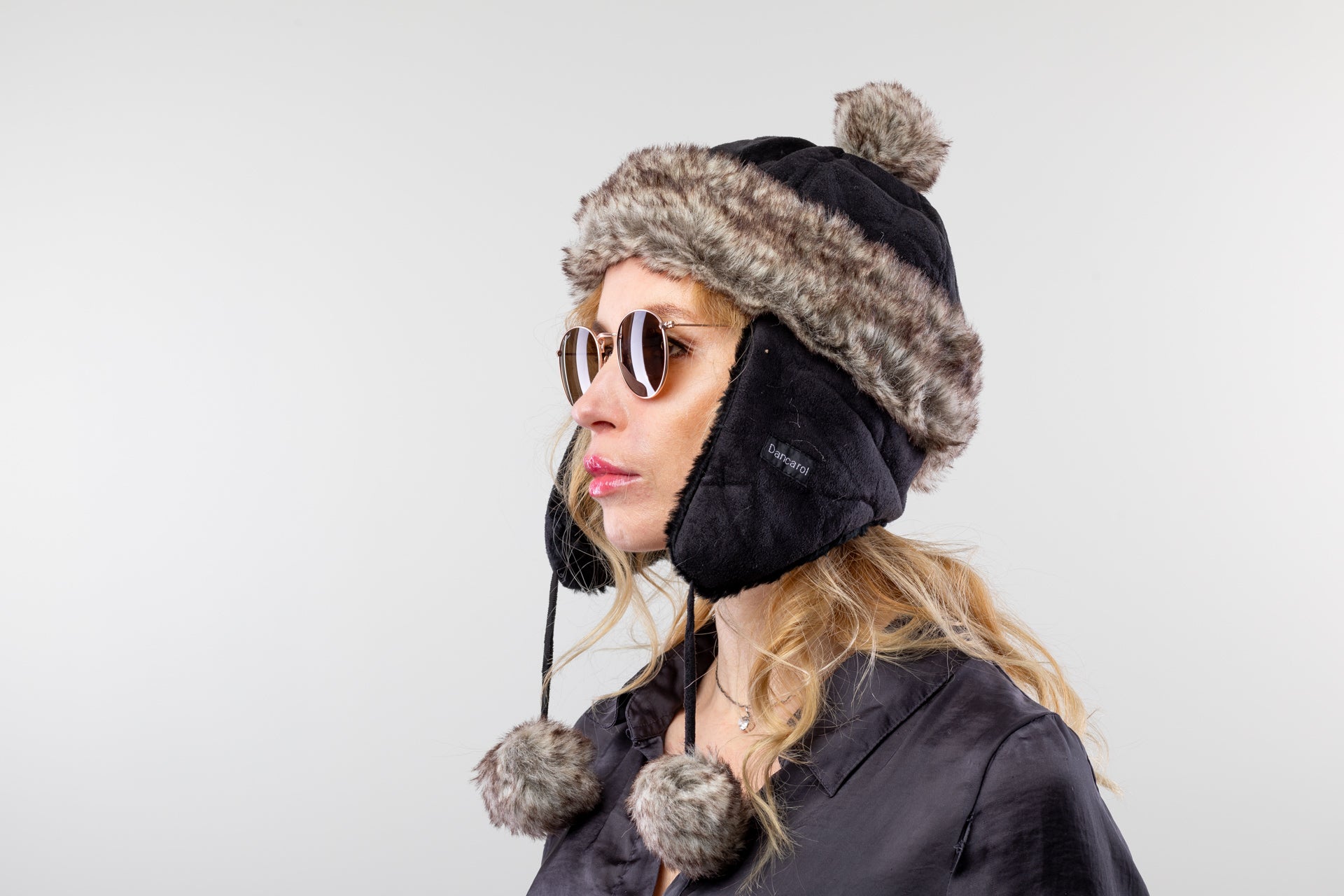 Winterlook aus Zentralasien! Mütze mit Ohrenklappen und Bommeln in Wildlederoptik. Mit weichem Kunstfell in Braun-meliert besetzt.