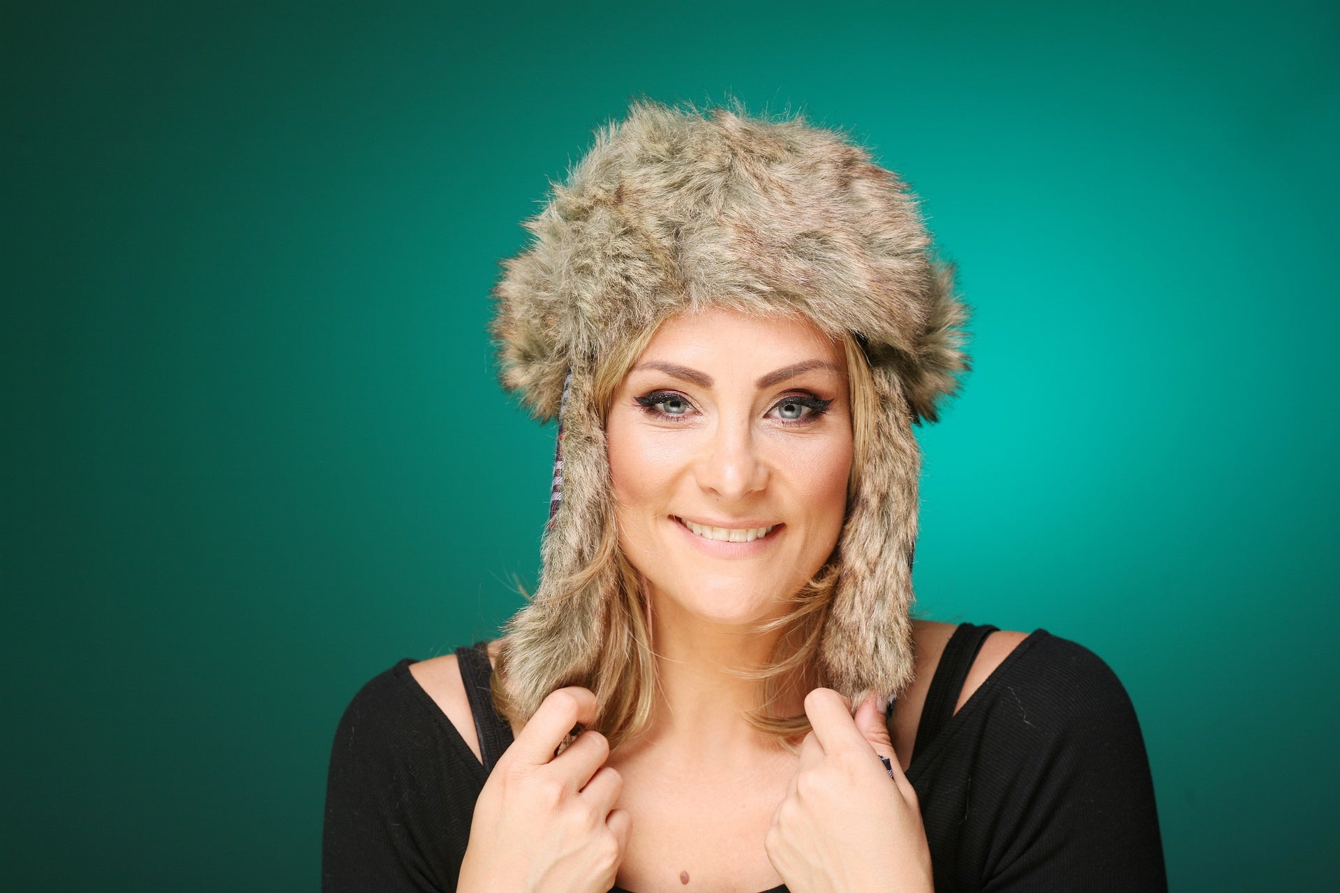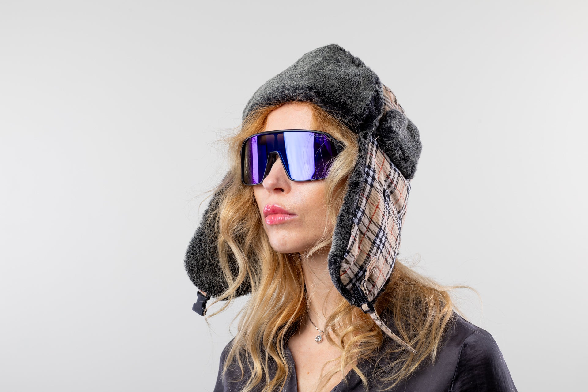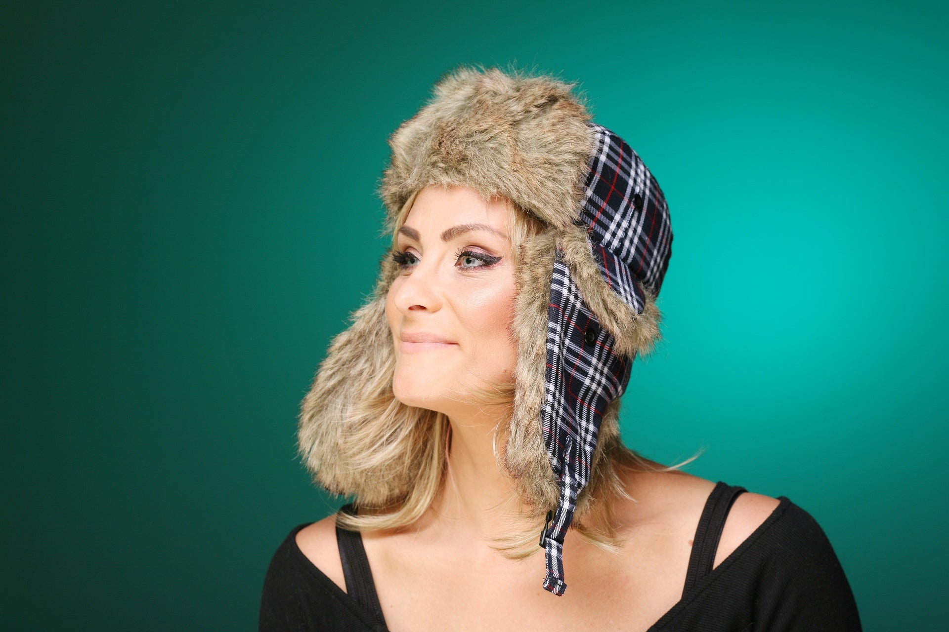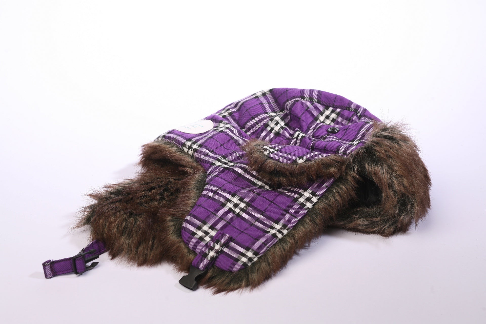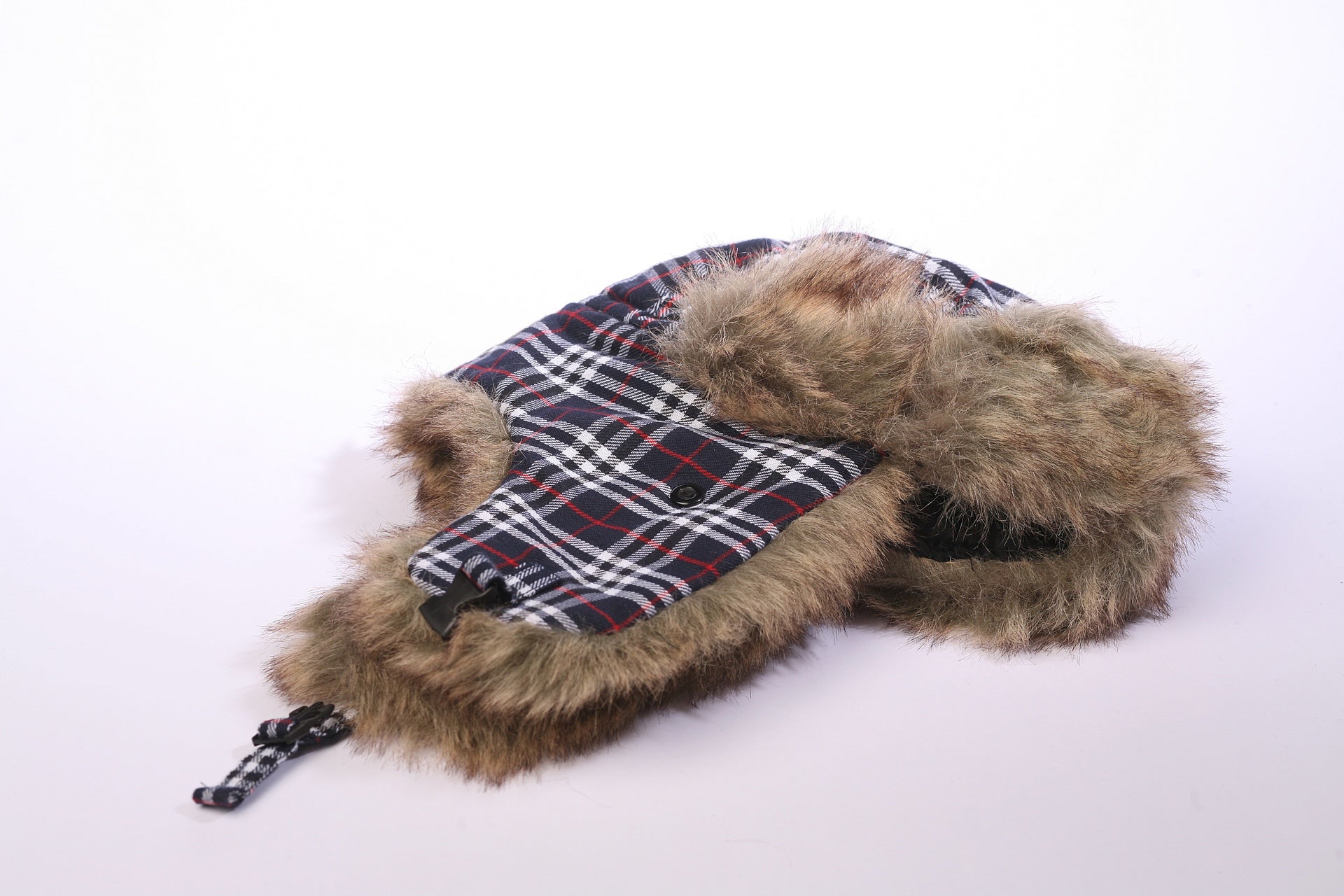 Trendy Mütze mit Ohrenklappen und Verschluß am Hals. Material in Baumwolloptik mit klassischem Karomuster, kombiniert mit Kunstfell hellbraun-meliert.